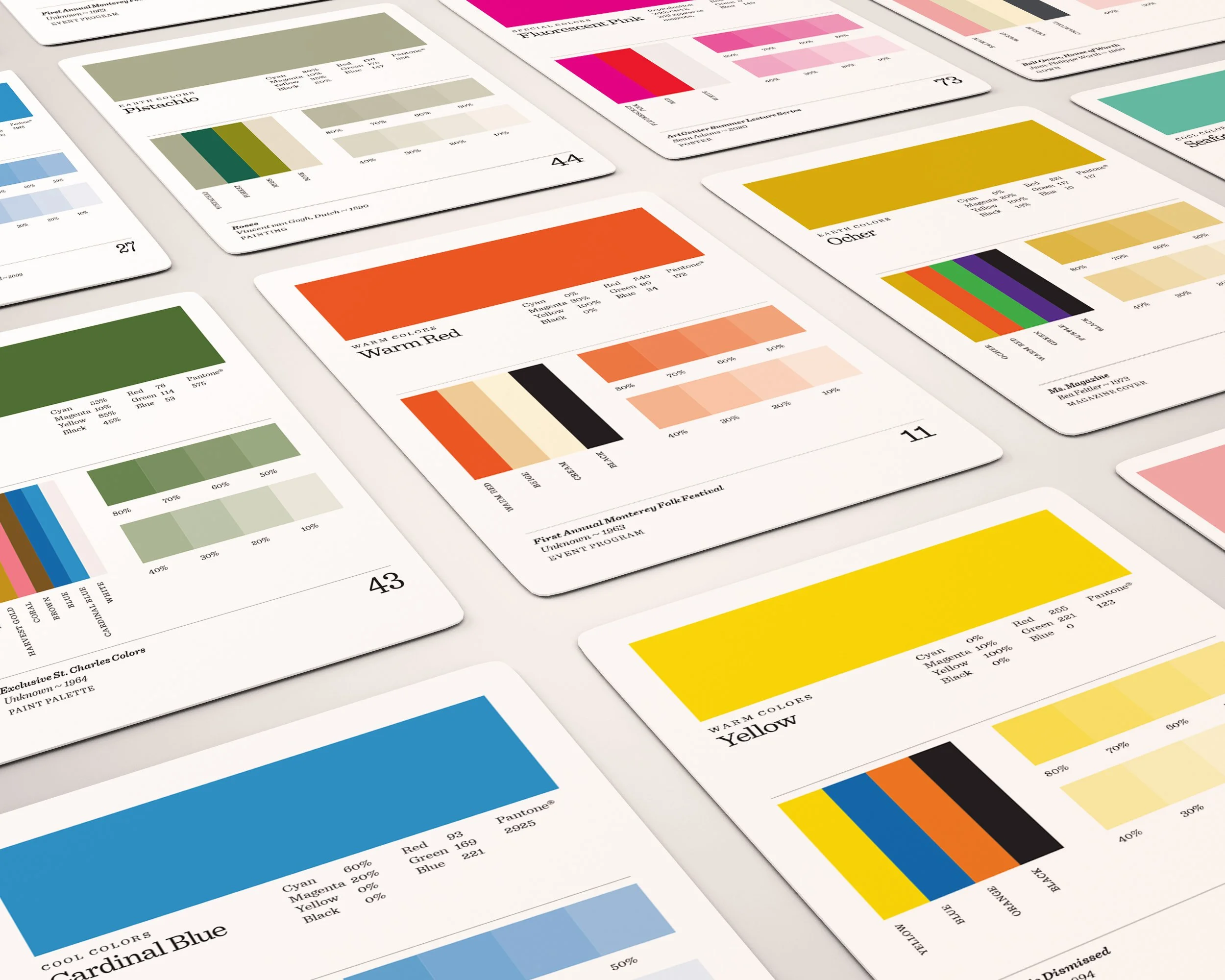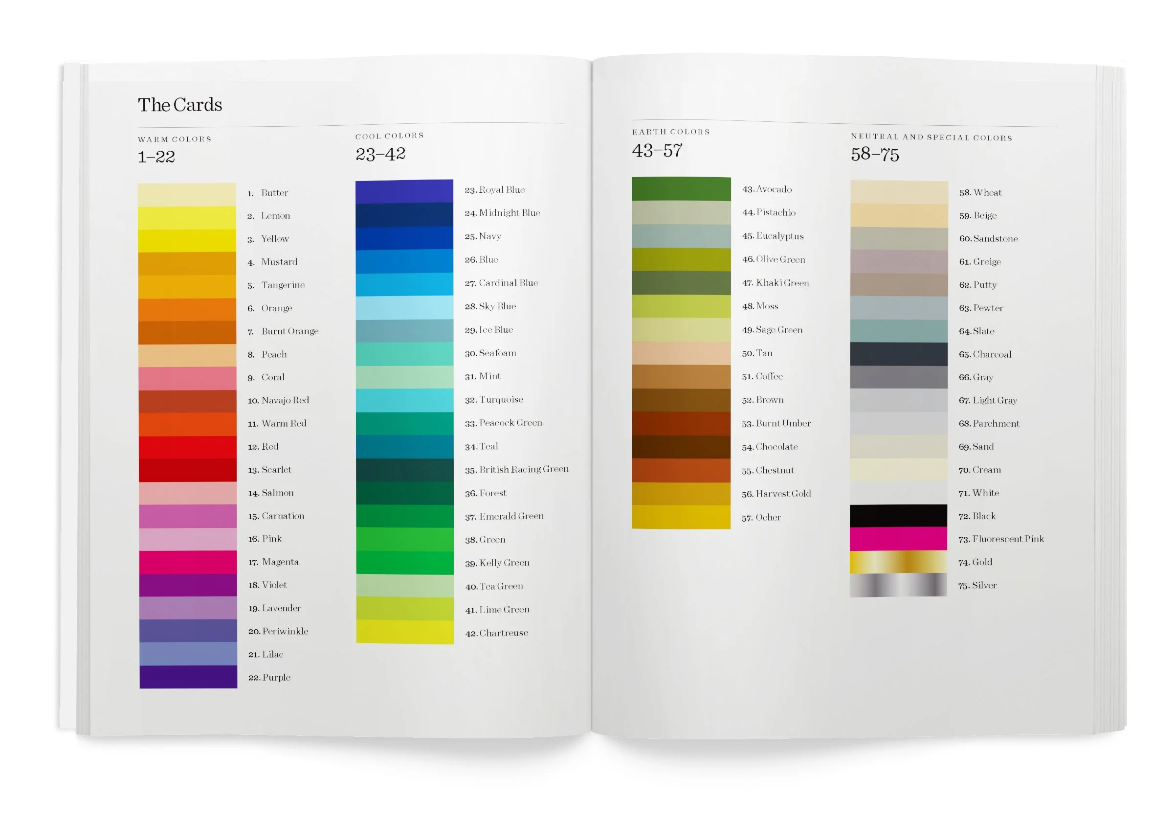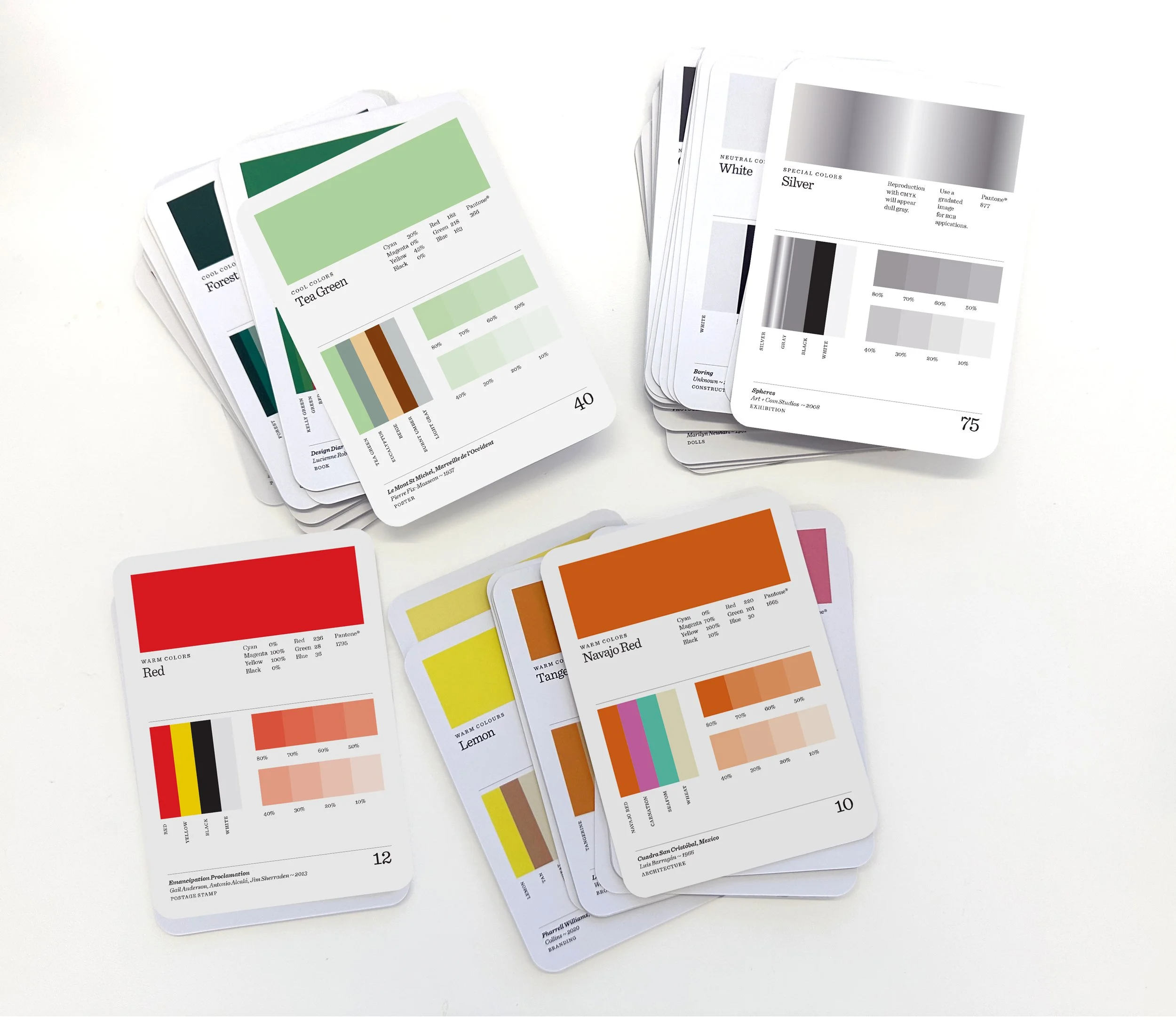 - 75 cards featuring a color on one side to mix-and-match color palettes, with suggested combinations and CMYK and RGB values on the reverse.