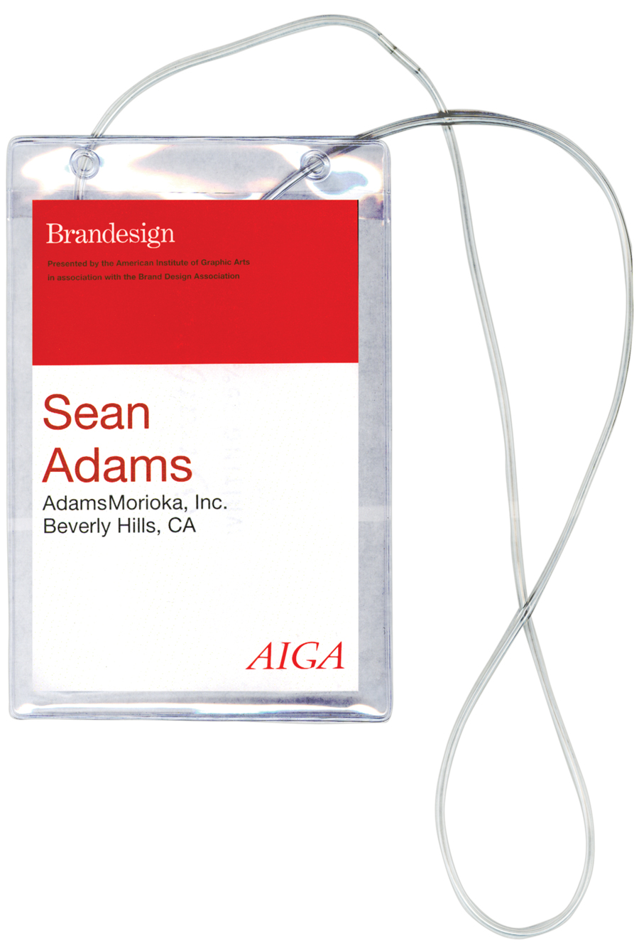 In 1996, I was asked to design the materials for the first AIGA Business Conference. I hate going to a conference and trying to deal with a batch of printed matter, the schedule, maps, and directories. Other people told me they would rather not stick pins in their shirt with a name badge. As I love plastics, I found a little plastic pouch at the Plastic Mart in Santa Monica. I believe it was to hold labels in hospitals. I used this, punched two holes in the top, and used IV tubing to hang the pouch from my neck. Now I could design all the materials, including the name tag, to fit inside the pouch. Easy peasy.
