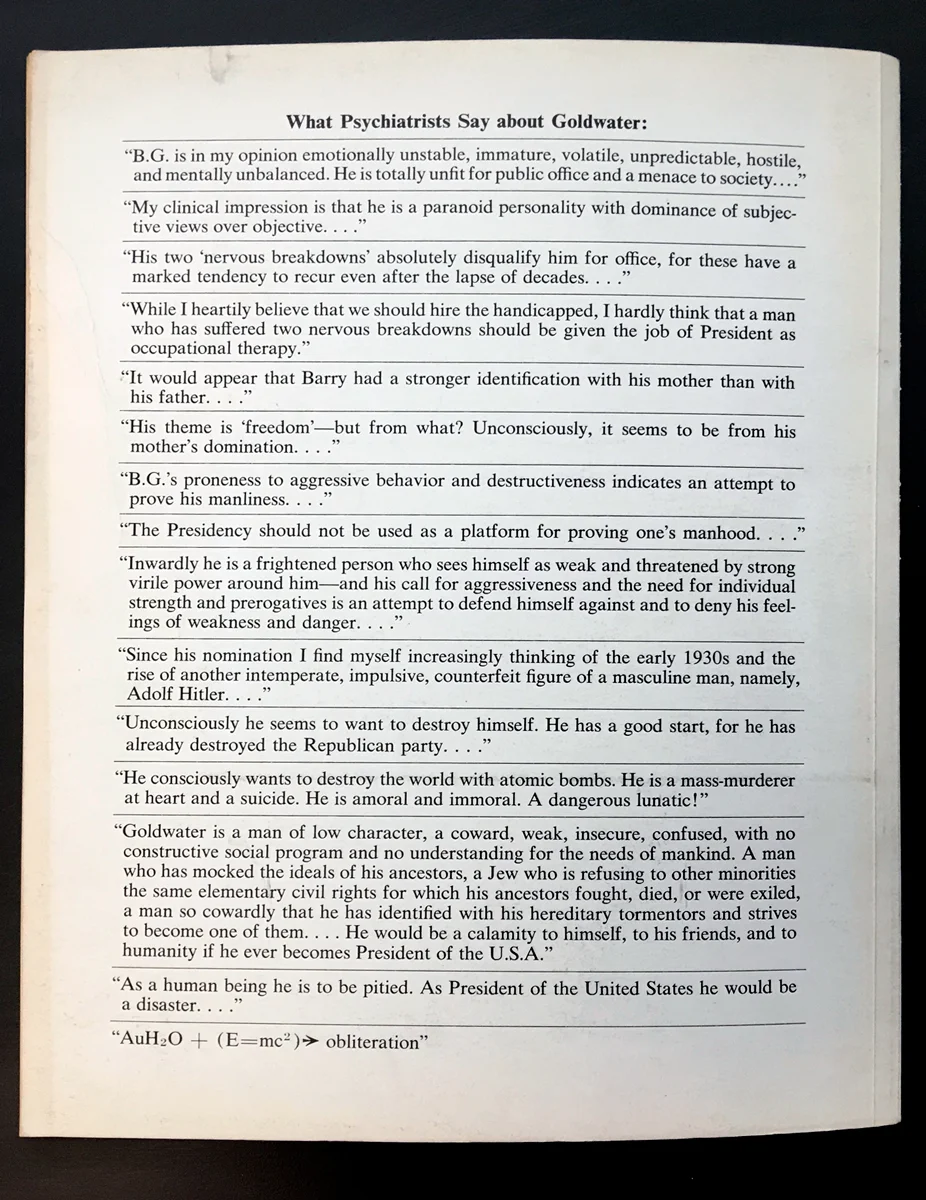 The cover is, like most of the fact: covers, to the point and unapologetic. The issue has one article, “Goldwater: The Man and the Menace,” and a section dedicated to “What Psychiatrists Say About Goldwater.” The tenor of the article is aggressive and acrimonious with sentences such as, “Those psychoanalysts who find a connection between sadism and an anal character will not be surprised that young Goldwater was fascinated by bathrooms.”