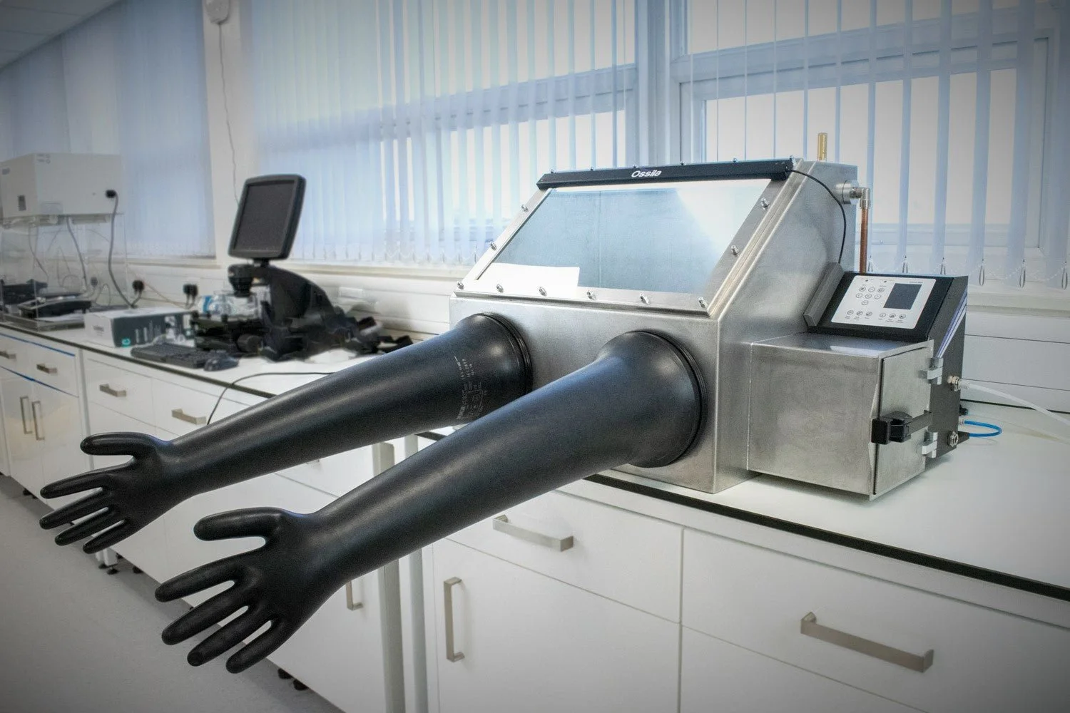 The space age theme is infused into the experience, and we worked hard to find avenues to express this in every part of the project. Bathrooms can be rather dull, and I had a wonderful idea to install the rubber gloves that are used for radioactive isolation boxes in the wall between the men’s room and women’s room.