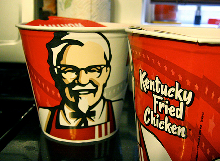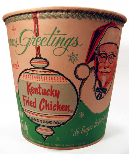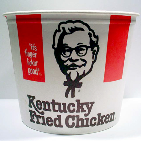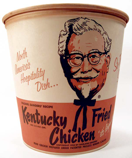 The complex issues aside, I’ve decided that a chicken bucket is a wonderful thing. I’d eat fried chicken every day for the rest of my life if it wouldn’t kill me, or turn me into someone that needed to be fed in bed and turned over with an oar. The old chicken buckets don’t shy away from information. The new buckets scream, “Brand, brand, brand.” I like information. It makes sense to do the giant “brand” design on something like a shopping bag. People carry it around and it becomes a billboard. This isn’t the case with fried chicken. I don’t see many people walking around malls with red fried chicken buckets.
