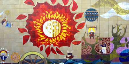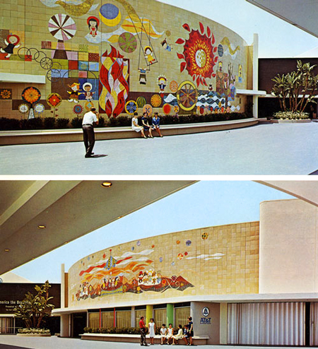 Sometimes I just want to share a thing of beauty. These are images of a mural Mary Blair designed in Tomorrowland. Theoretically, they are still there underneath a rather uninteresting mural for Star Tours. No major insights here, just something wonderful.