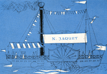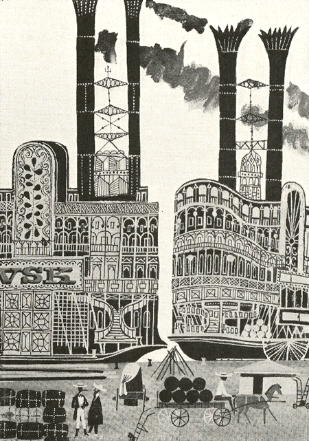 One of my bizarre obsessions is riverboats. I don’t particularly want to take a ride on a new casino riverboat in St. Louis, but I’d be fine taking a riverboat cruise in 1850 up the Mississippi. I’ve found a repeating motif of riverboats in illustrations between 1950 and 1960. They were used on ads for pharmaceutical products, handkerchiefs, posters, and wallpaper. If the riverboat craze happened in 1940 it would make sense. Gone With the Wind was released in 1939, and all things antebellum south were the cat’s pajamas. Perhaps the 1950s trend with riverboats had something to do with the nostalgia for a simpler time when atomic warfare was a constant worry.