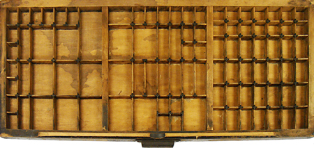 I’m a sucker for type cases. I worked in the metal type shop at school, and learned the California case like the back of my hand. As you can imagine, that’s come in real handy over the years. I’d like to have a type case that I could use to hang on the wall, and organize little objects. Perhaps these would be pieces of wood type, rocks, or shells. The Hi-Speed card is a tiny representation of a type case. I know it’s not accurate, but so what? It has a cool big hand and row of George Washington, Benjamin Franklin, and Abraham Lincoln. That is why it is currently the favorite of favorites in the business card box.
