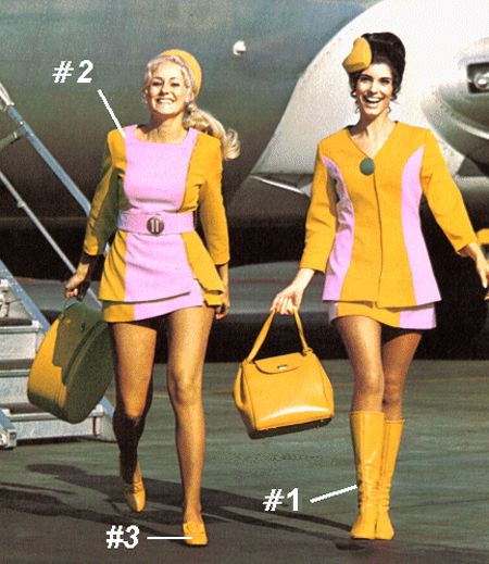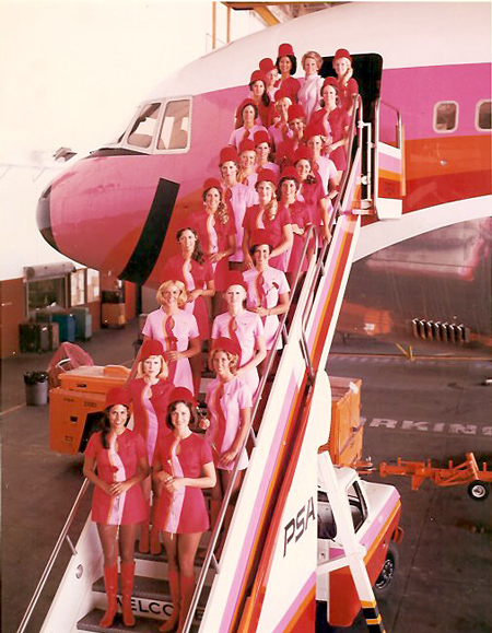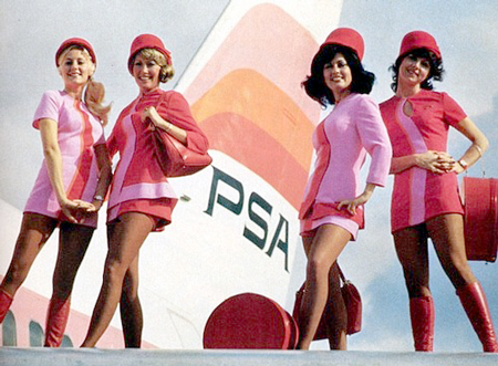 In the 1960s, Branniff Airlines had a groovy thing going on. Alexander Girard designed a great program that made every other airline look boring and sad. But one little company was leaving Branniff in the dust regarding grooviness. Pacific Southwest Airlines was a regional airline on the west coast. Many of us remember the PSA planes with the smile on the front. But do you remember the super-fine uniforms and graphics? Today, I fly American Airlines exclusively. Their uniforms are clean and professional. My sister is an American Airlines flight attendant, and once I mention that on-board, the other flight attendants are extra nice. I guess it’s good to project a business atmosphere on a plane. However, the PSA uniforms are so incredible and bright. Of course, they didn’t project a business atmosphere, unless it was businessmen watching women pole-dancing.