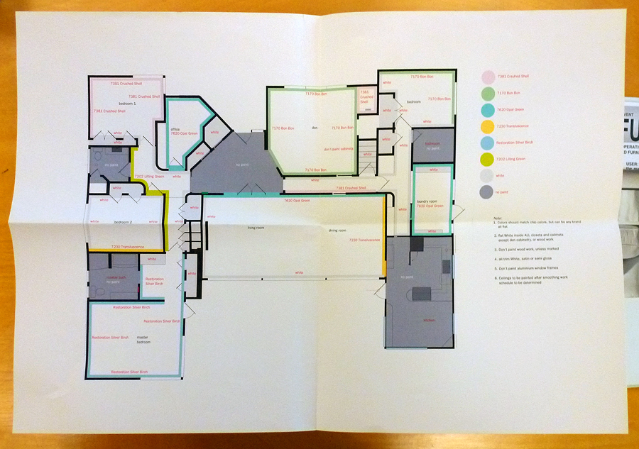 The binder is made up of different sections: contact info and business cards, paint swatches and diagram, construction records, major appliance information, and ongoing work. I use the handy plastic sleeves for cards, swatches, and items that don’t fit easily. A binder is a gift from the gods.