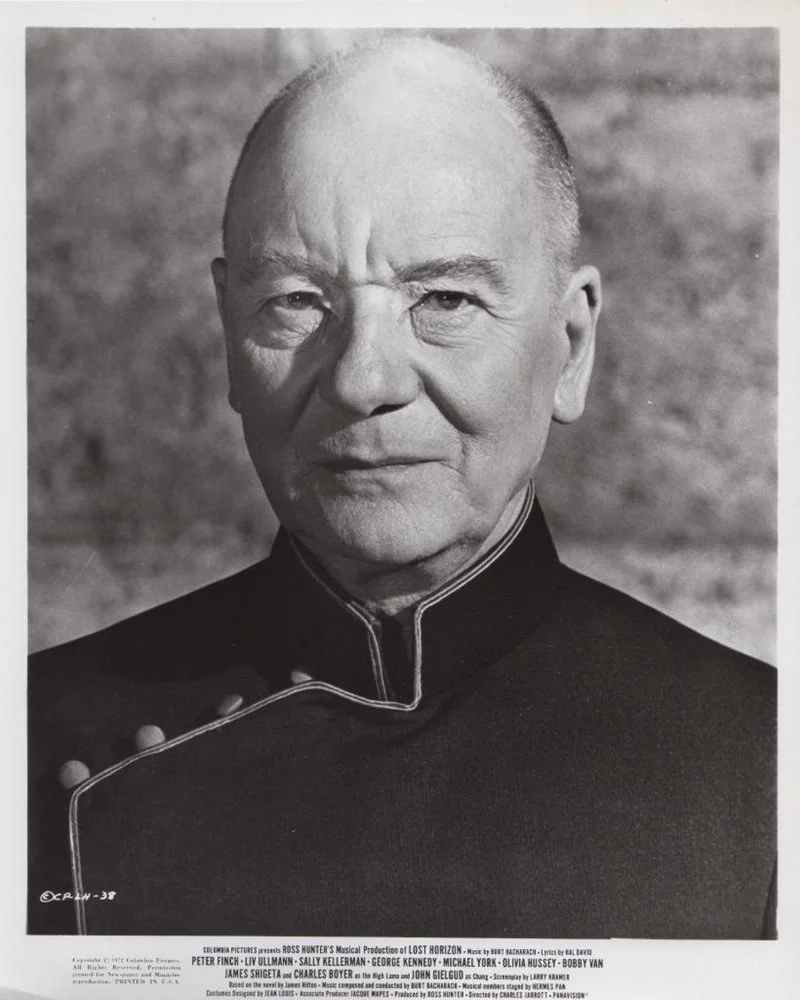 Let’s switch gears here. Lost Horizon was a remake in 1973 of a classic 1930s movie. It was the last of the big epic musicals. Burt Bachrach and Hal David wrote the score and the film starred seasoned and lauded actors: Peter Finch, Liv Ullmann , Sally Kellerman, George Kennedy, Michael York, and Olivia Hussey. Ross Hunter produced the film. The plot involves a group of white people fleeing a no-name revolution somewhere. Their plane is hijacked and flown to the Himilayas. The plane crashes and oddly nobody is injured in any way, except for some coffee spilling except for the only Asian, the pilot, who is dead. The survivors are soon rescued by people with giant fur coats carrying torches in the blizzard. Fortunately, Sir John Gielgud is among the rescuers. Oddly, Gielgud plays an Asian with a British accent but looks just like John Gielgud.